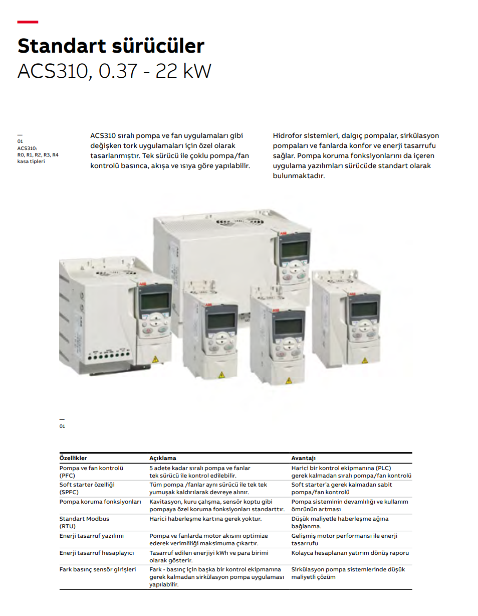 Standart sürücülerACS310, 0.37 - 22 kW ACS310 sıralı pompa ve fan uygulamaları gibideğișken tork uygulamaları için özel olaraktasarlanmıștır. Tek sürücü ile çoklu pompa/fankontrolü basınca, akıșa ve ısıya göre yapılabilir. Hidrofor sistemleri, dalgıç pompalar, sirkülasyonpompaları ve fanlarda konfor ve enerji tasarrufusağlar. Pompa koruma fonksiyonlarını da içerenuygulama yazılımları sürücüde standart olarakbulunmaktadır
