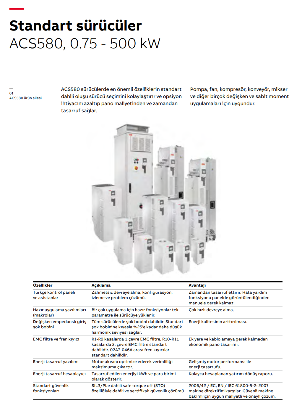 Standart sürücülerACS580, 0.75 - 500 kW ACS580, sürücülerde en önemli özelliklerin standart dahili oluşu sürücü seçimini kolaylaştırır ve opsiyon ihtiyacını azaltıp pano maliyetinden ve zamandan tasarruf sağlar. Pompa, fan, kompresör, konveyör, mikser ve diğer birçok değişken ve sabit moment uygulamaları için uygundur