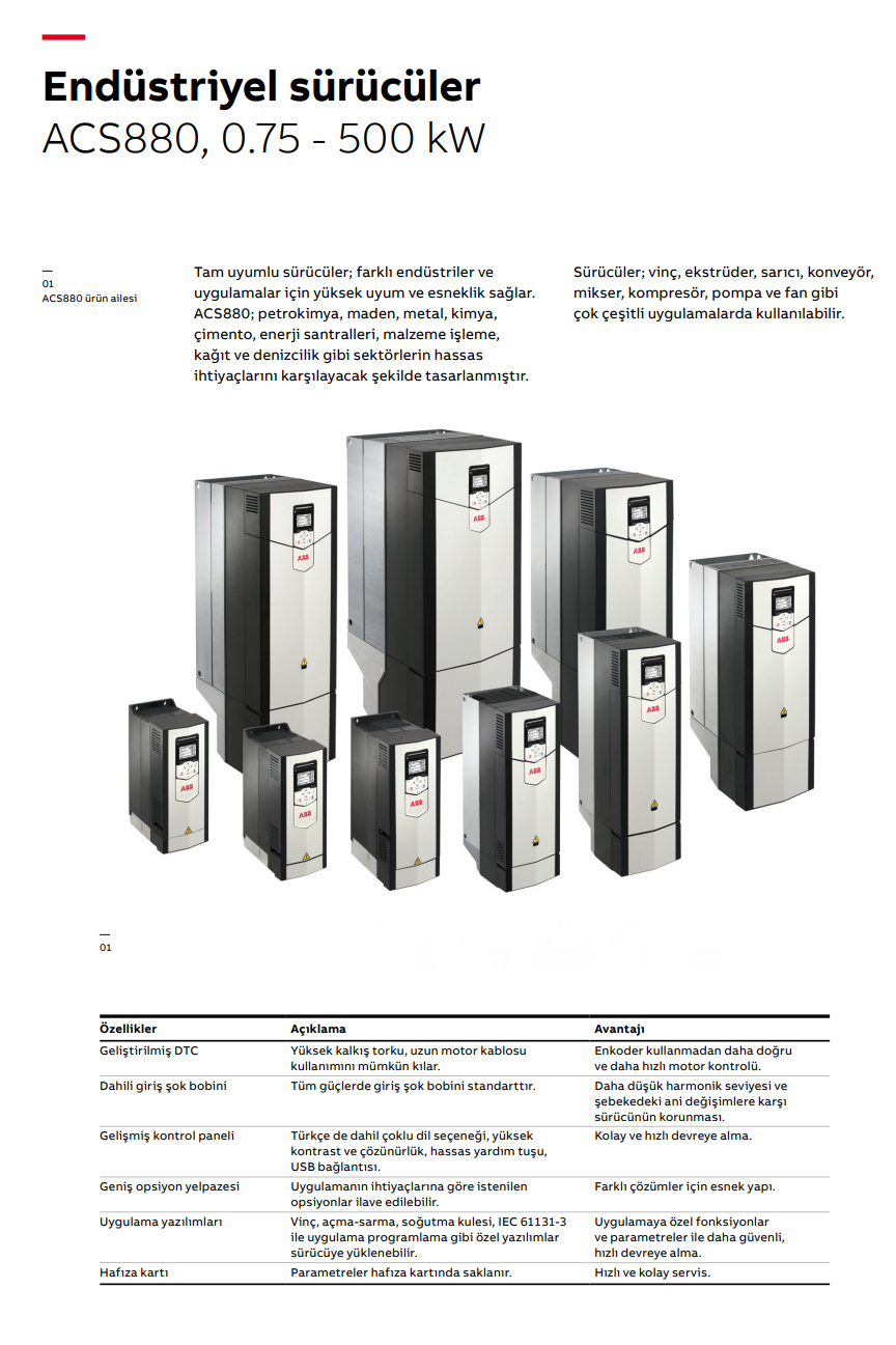 Tam uyumlu sürücüler; farklı endüstriler ve uygulamalar için yüksek uyum ve esneklik sağlar. ACS880; petrokimya, maden, metal, kimya, çimento, enerji santralleri, malzeme işleme, kağıt ve denizcilik gibi sektörlerin hassas ihtiyaçlarını karşılayacak şekilde tasarlanmıştır.