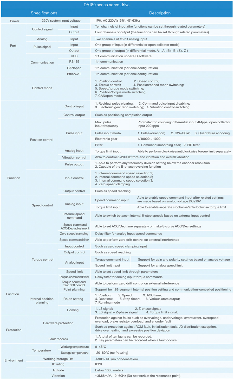 • Güç aralığı : 100W ile 2Kw arası• Hız yanıt frekansı 2.0 kHz• Geniş haberleşme arayüzleri : Modbus, CANopen, EtherCAT (ops)• Doğru konumlandırma: 17-bit• Dahili point-to-point (PTP) kontrol