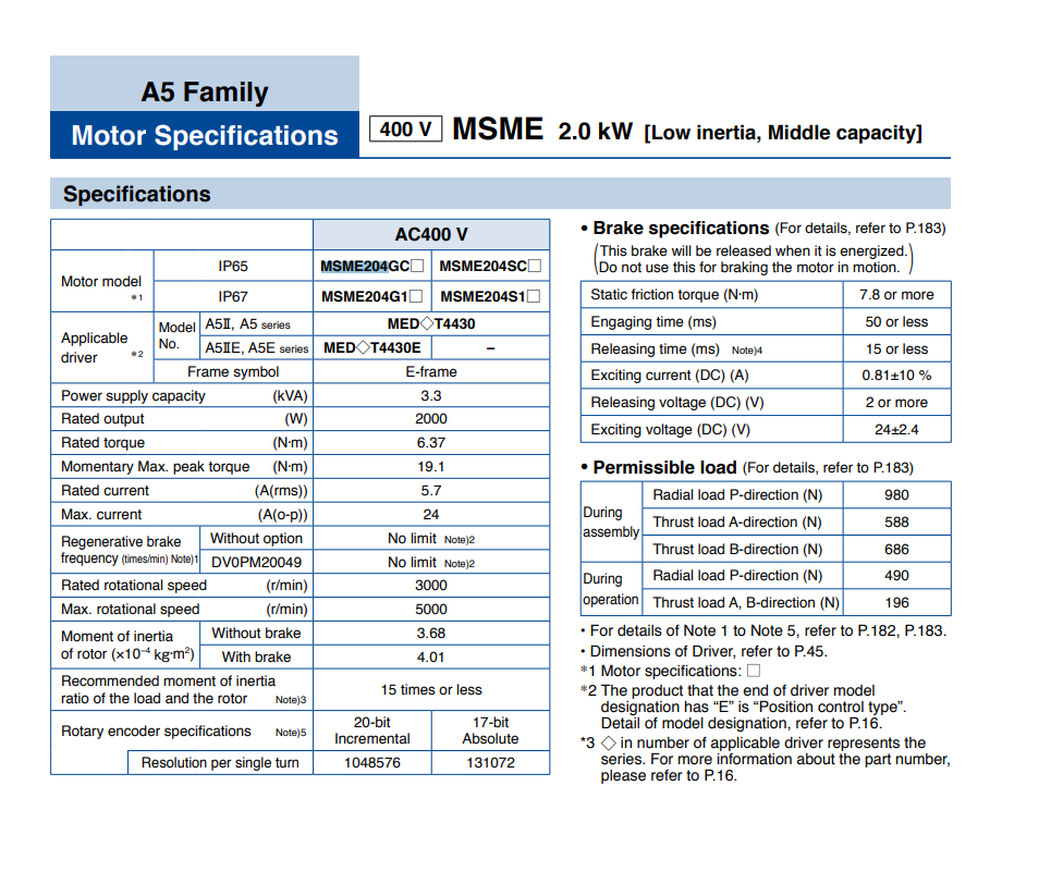 Series MINAS A5   Output Power 2000W (2kW)   Power Supply 400VAC   RPM 3000 RPM   Torque - Rated 6.37Nm   Encoder Incremental   Size / Dimension 100.00x100.00mm   Diameter - Shaft 19.00mm   Length - Shaft and Bearing 55.00mm   Mounting Hole Spacing 115.00mm