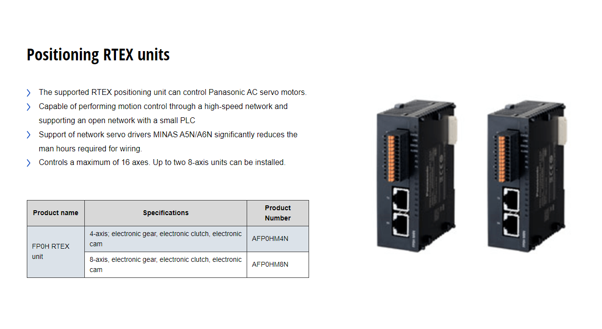 • The supported RTEX positioning unit can control Panasonic AC servo motors.