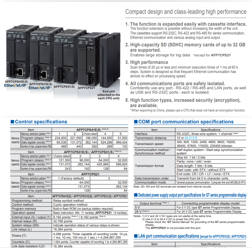 PANASONİC FP7CPS31ES Ethernet, RS232C, 11nS Çevrim