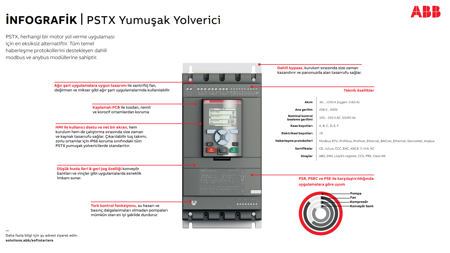 Teknik bilgi• Çalışma gerilimi: 208 – 690 VAC• Geniş nominal kontrol besleme gerilimi:100 – 250 V, 50/60 Hz• PSTX nominal çalışma akımı: 30’dan 1250A’ekadar (üçgen: 2160A) 3 faz kontrollü• Direkt ve üçgen bağlantı• Rutubet, toz ve korozif etkilere karşı verniklielektronik kartlar• Ayrılabilir tuş takımı IP66 (Tip 1, 4X,12)• Kolay ayarlanabilen ve 17 farklı dil seçeneğinesahip grafik ekran• Montajı hızlandıran ve enerji tasarrufusağlayan dahili bypass• Kontrol ve izleme için dahili Modbus RTU• Tüm temel haberleşme protokollerine uyum• Akım, gerilim, güç faktörü vs. ölçümü içinanalog çıkışHaberleşme protokolleri:• Standart dahili: Modbus RTU• Anybus/FBP:- MODBUS RTU- PROFIBUS- DeviceNet- EtherNet/IP- PROFINETSertifikalar:• CE, cULus, CCC, EAC, ANCE,C-tick, ABS, DNV GL, Lloyd's Register, CCS, PRS, Class NK