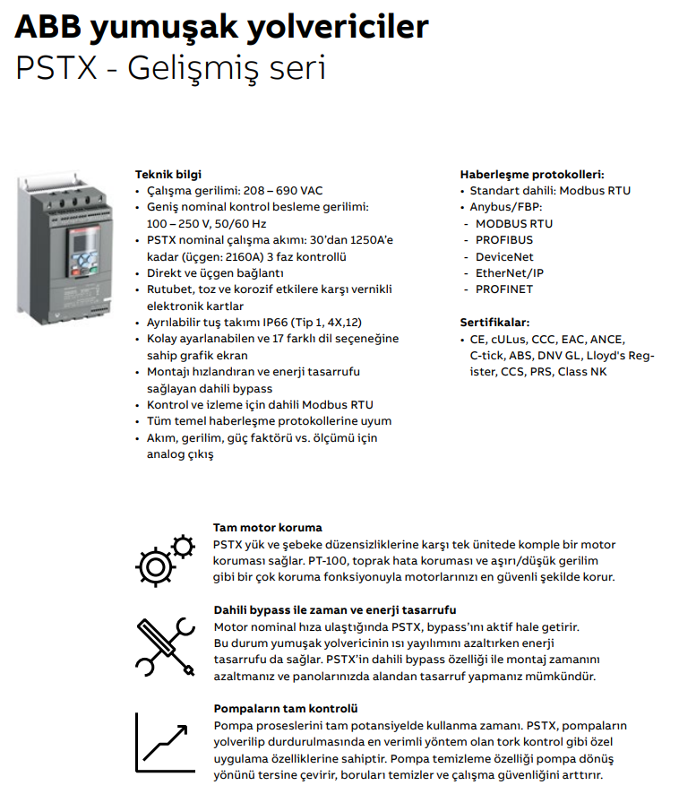 Teknik bilgi• Çalışma gerilimi: 208 – 690 VAC• Geniş nominal kontrol besleme gerilimi:100 – 250 V, 50/60 Hz• PSTX nominal çalışma akımı: 30’dan 1250A’ekadar (üçgen: 2160A) 3 faz kontrollü• Direkt ve üçgen bağlantı• Rutubet, toz ve korozif etkilere karşı verniklielektronik kartlar• Ayrılabilir tuş takımı IP66 (Tip 1, 4X,12)• Kolay ayarlanabilen ve 17 farklı dil seçeneğinesahip grafik ekran• Montajı hızlandıran ve enerji tasarrufusağlayan dahili bypass• Kontrol ve izleme için dahili Modbus RTU• Tüm temel haberleşme protokollerine uyum• Akım, gerilim, güç faktörü vs. ölçümü içinanalog çıkışHaberleşme protokolleri:• Standart dahili: Modbus RTU• Anybus/FBP:- MODBUS RTU- PROFIBUS- DeviceNet- EtherNet/IP- PROFINETSertifikalar:• CE, cULus, CCC, EAC, ANCE,C-tick, ABS, DNV GL, Lloyd's Register, CCS, PRS, Class NK
