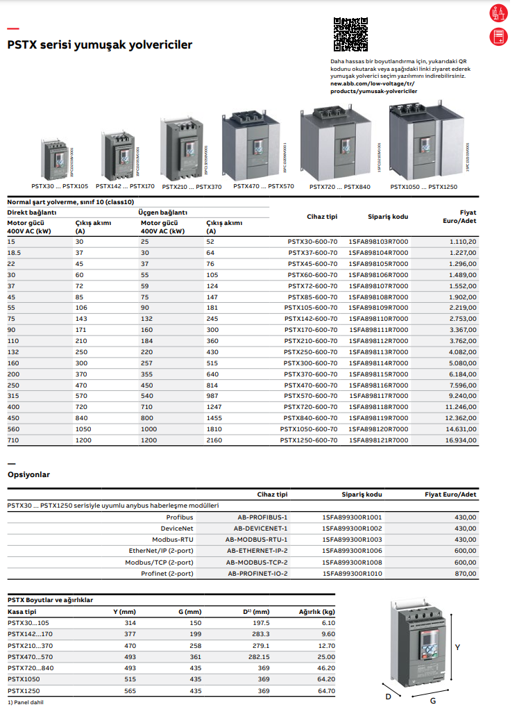 Teknik bilgi• Çalışma gerilimi: 208 – 690 VAC• Geniş nominal kontrol besleme gerilimi:100 – 250 V, 50/60 Hz• PSTX nominal çalışma akımı: 30’dan 1250A’ekadar (üçgen: 2160A) 3 faz kontrollü• Direkt ve üçgen bağlantı• Rutubet, toz ve korozif etkilere karşı verniklielektronik kartlar• Ayrılabilir tuş takımı IP66 (Tip 1, 4X,12)• Kolay ayarlanabilen ve 17 farklı dil seçeneğinesahip grafik ekran• Montajı hızlandıran ve enerji tasarrufusağlayan dahili bypass• Kontrol ve izleme için dahili Modbus RTU• Tüm temel haberleşme protokollerine uyum• Akım, gerilim, güç faktörü vs. ölçümü içinanalog çıkışHaberleşme protokolleri:• Standart dahili: Modbus RTU• Anybus/FBP:- MODBUS RTU- PROFIBUS- DeviceNet- EtherNet/IP- PROFINETSertifikalar:• CE, cULus, CCC, EAC, ANCE,C-tick, ABS, DNV GL, Lloyd's Register, CCS, PRS, Class NK